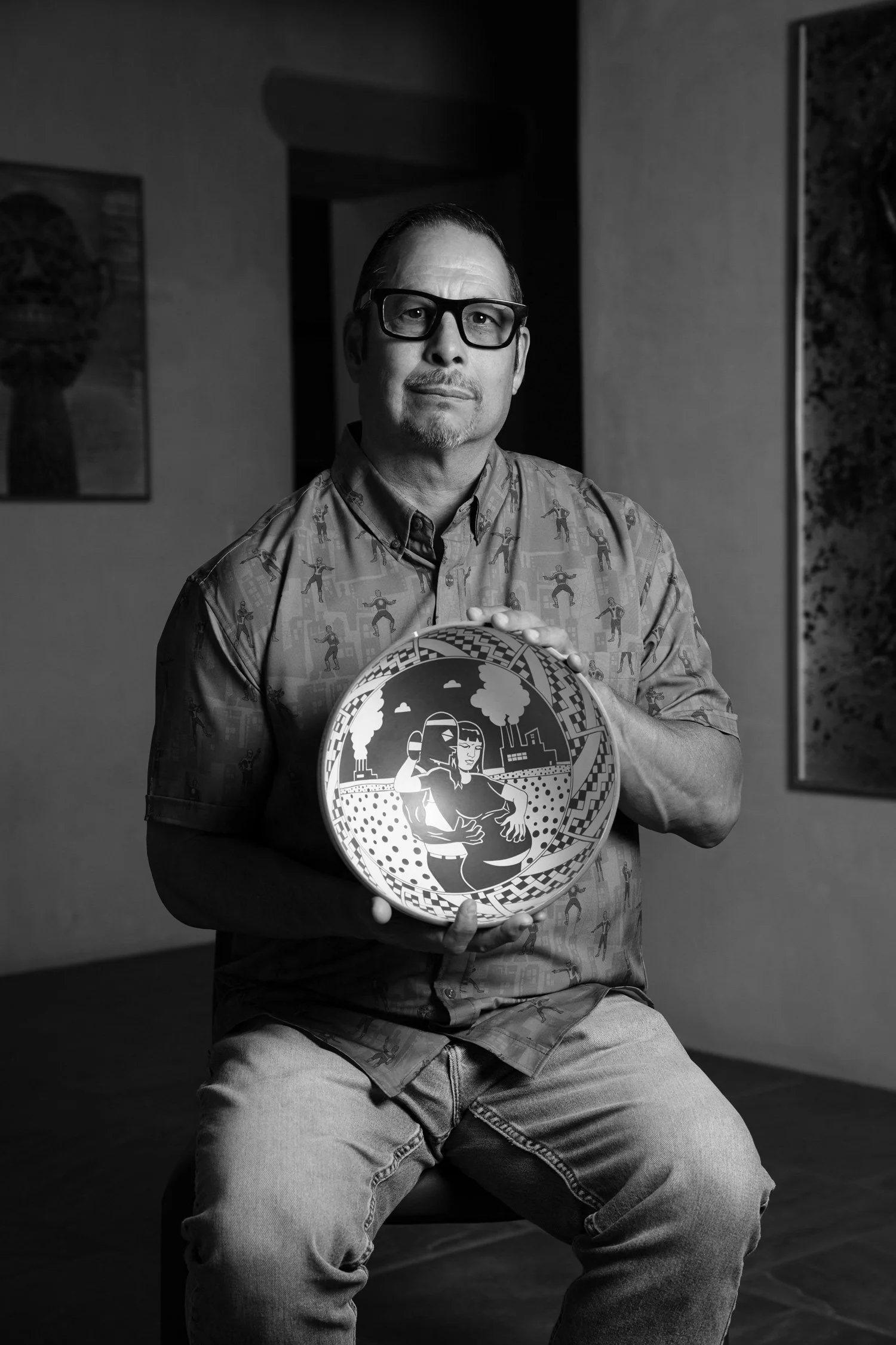 Diego Romero firmly positions his work within an Indigenous visuality. He has built a career constructing ceramic vessels that elevate Pueblo life to Olympian stature. A third-generation professional artist, Romero was born to a Cochiti father and a non-Native mother and raised in Berkeley, California. Upon completing high school, he returned to his ancestral Pueblo lands. He attended the Institute of American Indian Arts before attaining degrees from Otis College of Art and Design (BFA) and the University of California, Los Angeles (MFA). Since earning an MFA in 1993, Romero has developed an extensive exhibition record with works housed in significant public collections such as the Metropolitan Museum of Art, the Cartier Foundation, the Peabody Essex Museum, the Denver Art Museum, the Heard Museum, the British Museum, and the Scottish National Museum. Working in a narrative style that evokes pre-contact Mimbres pottery, as well as Greek amphorae (two-handled vases) and Anasazi ceramics, Romero's earthenware bowls and handled-vessels investigate the marginalized status of Indigenous history and society. Using historically situated oral traditions as source material, Romero departs visually from the canonical work of Pueblo pottery and instead relies heavily on a narrative style gleaned from comic books and popular culture, specters of a childhood spent mingling in comic book stores. The resulting composition transcends the object's materiality, engaging the viewer in a humorous interplay in which the author's overt anti-colonial content maintains a non-threatening quality for audiences and collectors.